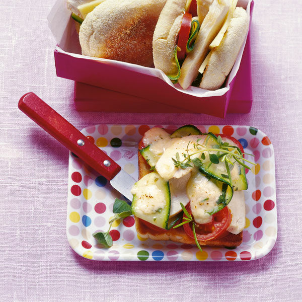 Tomaten waschen, in Scheiben schneiden. Toastscheiben toasten, Tomaten darauf verteilen. Fleisch in Scheiben schneiden, mit den Zucchini darauf legen. Den Käse reiben, darüber streuen und die Toasts im heißen Ofen (oben) 5-6 Min. überbacken.