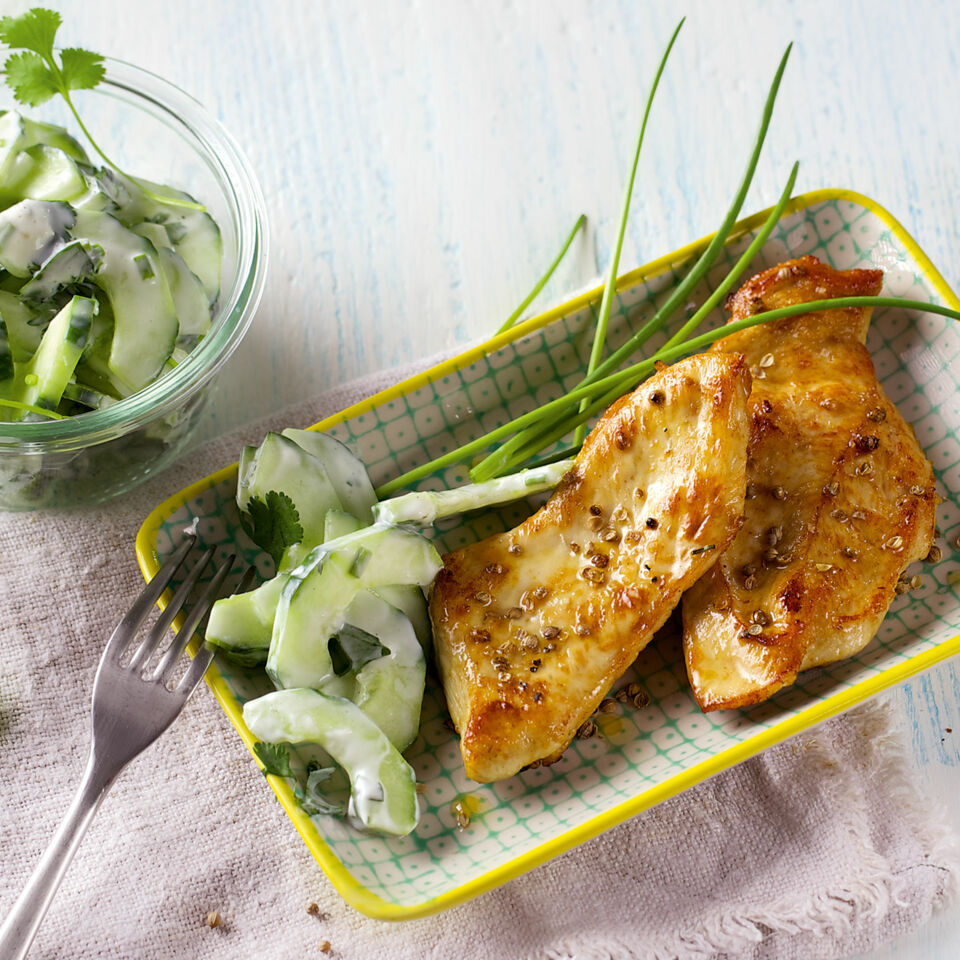 Die Butter in der Pfanne zerlassen und die Hähnchenschnitzel darin bei mittlerer Hitze ca. 10 Min. sanft braten. Das Fleisch mit Koriander bestreuen, mit Salz und Pfeffer würzen und ab und zu wenden. Den Gurkensalat abschmecken und mit den Schnitzeln und der Korianderbutter anrichten.