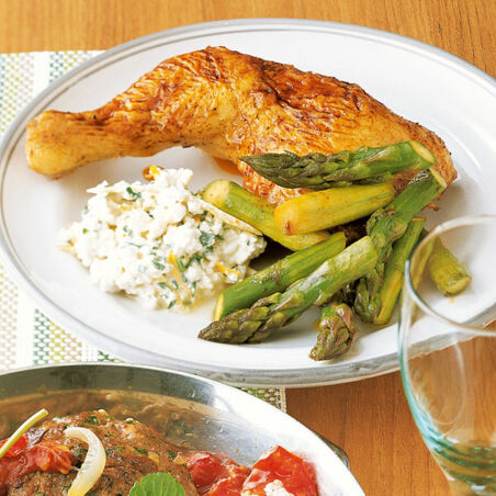 Süßlich-würzig marinierte Hähnchenschenkel mit knackigem grünen Spargel - da schlagen Gästeherzen höher.