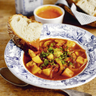 Perlzwiebeln in einem Sieb abtropfen lassen und mit dem Hähnchenfilet unter die Sauce mischen. Alles noch einmal gut erwärmen und das Ragout mit Salz und Pfeffer abschmecken. Mit knusprigem Baguette servieren.