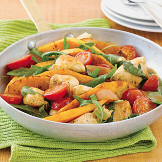 Rucola verlesen, waschen und trocken schleudern. Die Tomaten waschen und vierteln. Die Zwiebel schälen und sehr fein würfeln. Die Hähnchenbrust quer in dünne Scheiben schneiden.