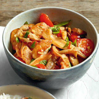 Fleisch zu der Tomatenmischung geben und kurz darin erwärmen. Basilikum unterheben und das Ragout zum Schluss mit Zucker, Salz und Pfeffer abschmecken. Dazu passen Bandnudeln.