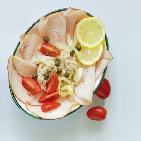 Der Klassiker wird hier einmal mit Hähnchenbrust-Aufschnitt serviert. Die Thunfischsauce dazu ist in Minuten fertig.