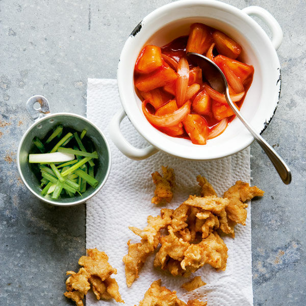 Das Frittieröl aus dem Wok gießen. 2 EL frisches Öl erhitzen. Den Knoblauch anbraten, Ananas, Tomate und Zwiebel dazugeben und ca. 4 Min. braten. Tomatenketchup, Austernsauce, Essig, übrigen Palmzucker und 100 ml Wasser unterrühren. Unter Rühren aufkochen, das Fleisch dazugeben und ca. 2 Min. weitergaren. Mit Pfeffer abschmecken, die Frühlingszwiebel unterheben und das Gericht auf einer Platte anrichten.