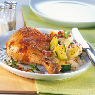 Mit diesem Rezept träumen wir uns ganz schnell in die Provence: Hähnchenkeulen aus dem Ofen treffen auf Tomaten, Maronen, Kerne und Kräuter.