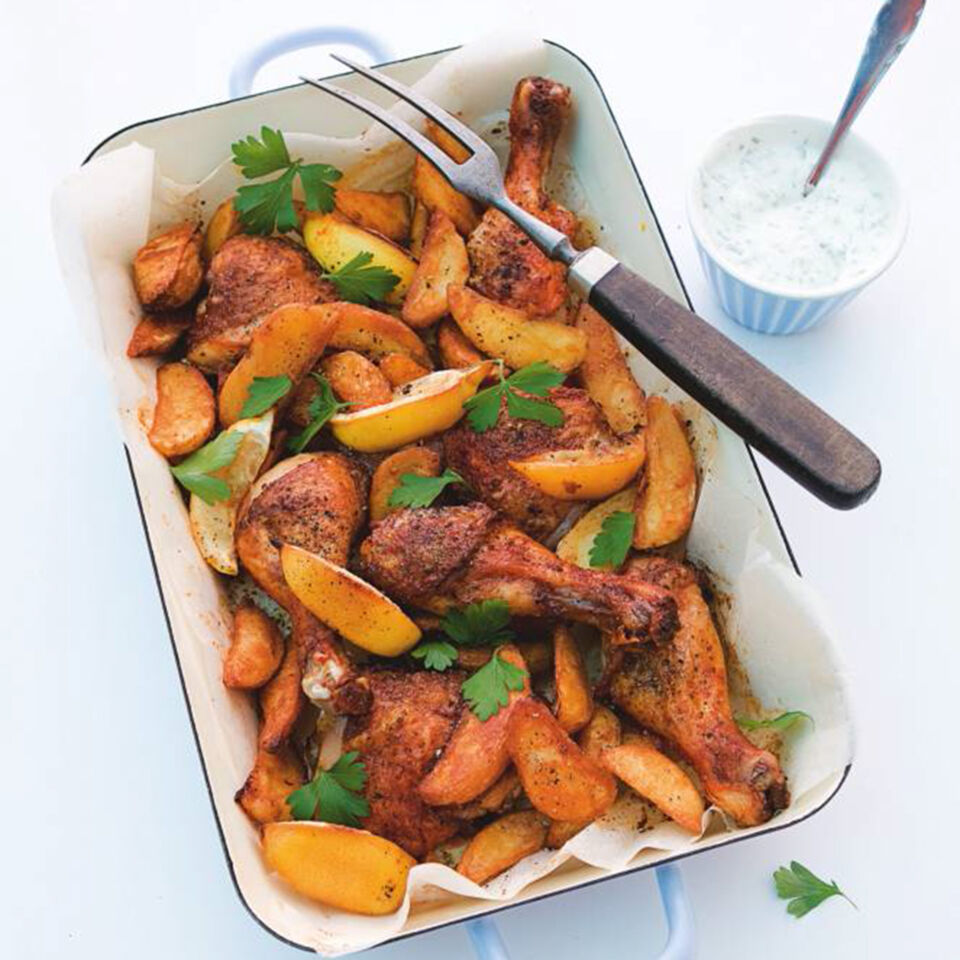 Hähnchenkeulen mit dem Würzöl einpinseln, mit Knoblauch, Zitronen und Kartoffeln auf dem Blech verteilen. Alles mit übrigem Würzöl beträufeln, salzen, pfeffern und im Ofen (Mitte) ca. 40 Min. backen. Saure Sahne verrühren und dazu servieren. Nach Belieben mit Petersilie bestreuen.