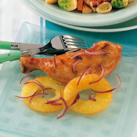 Die Hähnchenkeulen auf die Ananasscheiben legen und im heißen Ofen (Mitte, Umluft 180°) etwa 40 Min. backen, bis sie schön gebräunt sind. Mit einem Stäbchen in die dickste Stelle stechen. Tritt klarer Saft aus, ist das Fleisch durchgegart, ist er rötlich, noch etwas weiterbraten.