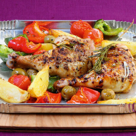 Der Sommer kann kommen! Mit knusprigen Hähnchenkeulen und mediterran gewürztem Gemüse – natürlich alles von einem Blech – breiten sich Urlaubsgefühle auf dem Tisch aus.