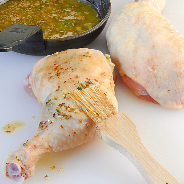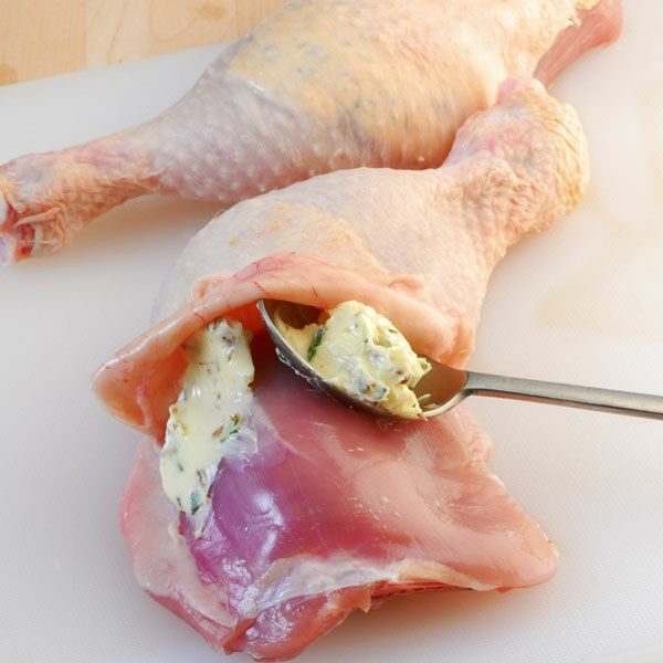 Die Hähnchenkeulen trocken tupfen und die Haut leicht mit den Fingern vom Fleisch lösen. Gut die Hälfte der Würzbutter unter die Haut schieben und verteilen. Übrige Würzbutter in einem Pfännchen schmelzen und die Keulen außen damit bestreichen. Salzen und pfeffern.