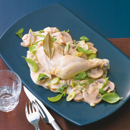 Der knusprige Klassiker mal etwas anders: Auf einer feinen Sauce aus leckeren Champignons und Frühlingszwiebeln werden die gedünsteten Hähnchenschenkel gebettet.