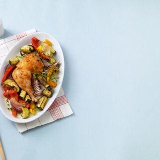 Dann die Bleche im Ofen tauschen, die Paprika auf dem Blech neben den Hähnchenschenkeln verteilen und im Ofen (oben), die Kartoffeln im Ofen (unten) noch 5-10 Min. garen.