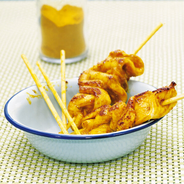 Die Holzspieße 5 Min. in warmem Wasser einweichen. Dadurch löst sich das Fleisch später besser vom Spieß.