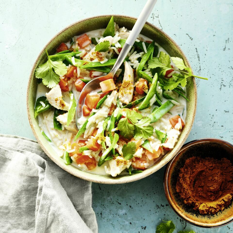 Ein Eintopf mit Hähnchen, Reis und Gemüse wärmt uns von innen und beruhigt den Magen.