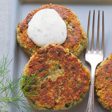 Kräuter waschen und trocken tupfen, Blätter hacken. Milch mit beiden Flocken vorsichtig erhitzen. Käse, Kräuter und Zitronenschale dazugeben, alles zu einem Teig verrühren. Mit Muskat, Salz und Pfeffer abschmecken. Mit angefeuchteten Händen Küchlein formen. Im heißen Öl von beiden Seiten goldgelb braten.