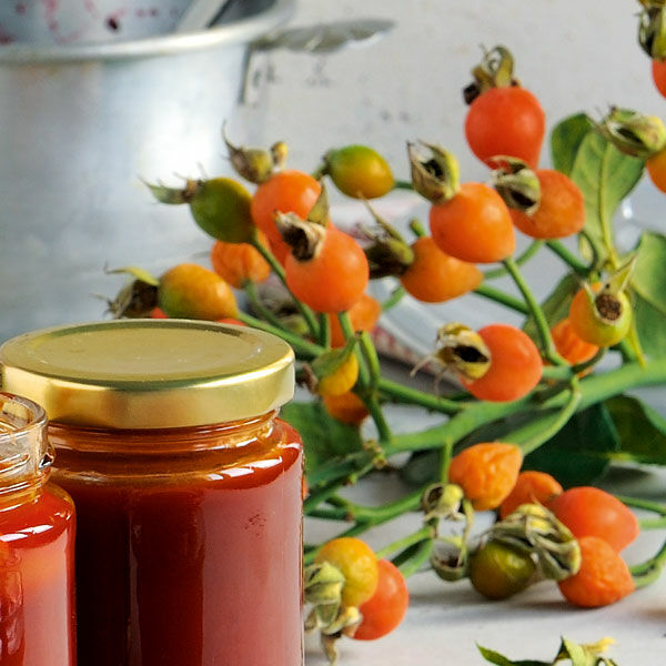 Hagebuttenmark enthält viel Vitamin C und ist daher in der kalten Jahreszeit zu empfehlen. Es schmeckt zu Desserts, als Brotaufstrich wie auch zu Wild und Käse.