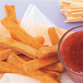 Jetzt das Frittieröl auf 180° erhitzen. Es ist heiß genug, wenn an einem hineingehaltenen Holzstäbchen sofort viele Bläschen aufsteigen. Darin die vorgebackenen Fries in 2-3 Min. knusprig frittieren. Herausheben und auf Küchenpapier entfetten.
