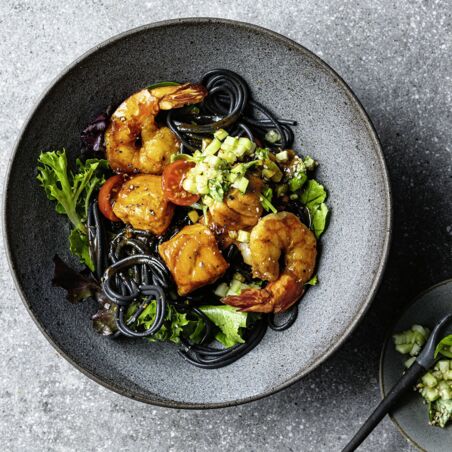 Durch die schwarzen Spaghetti macht diese Nudel-Bowl optisch schon gut was her. Geschmacklich kann sie da aber auf jeden Fall mithalten. Eine Harissa-Tomaten-Sauce sorgt für einen fein-würzigen und aromatischen Geschmack, der perfekt zum Lachs und zu den Garnelen passt.