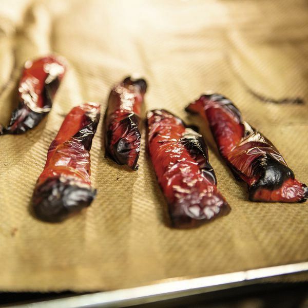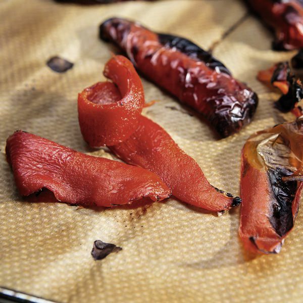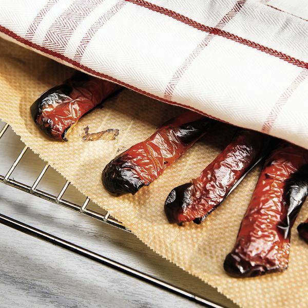 Die Paprikaspalten im Backofen (Mitte, Umluft 230°) 10 - 15 Min. backen, bis die Haut großflächig schwarz ist und Blasen wirft. Sobald sich die ersten Verfärbungen an der Paprikahaut zeigen, die Chilischoten dazugeben und mitbacken. Paprika und Chilis aus dem Ofen nehmen, zunächst mit Backpapier, dann mit einem Küchentuch zudecken und 10 Min. ruhen lassen.