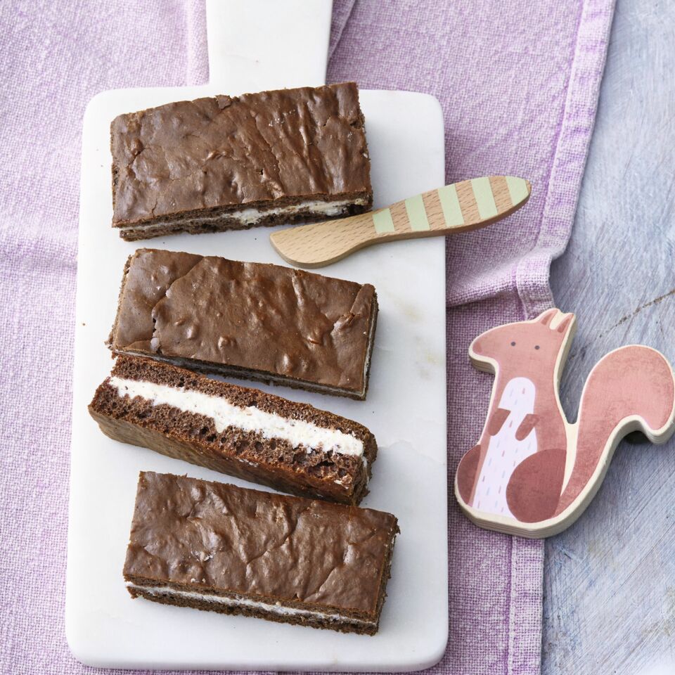 Zwei Teigstücke auf ein Küchenbrett legen und je die Hälfte der Füllung gleichmäßig darauf verteilen. Die beiden restlichen Teigstücke darauflegen. Die Schnitten ca. 50 Min. tiefkühlen. Dann die Teigsandwiches mit einem scharfen Messer quer halbieren und längs in vier Teile schneiden. Direkt servieren oder im Kühlschrank aufbewahren.