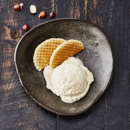 Die Schüssel vom Wasserbad nehmen und 1 Prise Salz in die Masse rühren. Die Masse zuerst in ca. 15 Min. auf Raumtemperatur abkühlen, dann in ca. 1 Std. 45 Min. im Kühlschrank ganz auskühlen lassen. Die kalte Haselnussmasse in die Eismaschine füllen und in ca. 45 Min. cremig bis fest gefrieren lassen. Das Eis aus der Maschine löffeln und sofort in vier Schälchen servieren oder in einer Gefrierbox mit Deckel tiefkühlen.