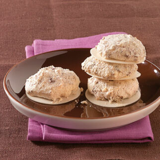 Den Teig mit zwei Teelöffeln auf die Oblaten streichen oder drücken und mit den Kernen bestreuen. Die Kerne dabei etwas festdrücken. Im Backofen (Mitte, Umluft 150°) 20 Min. backen.