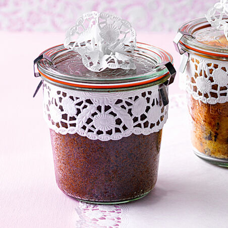Gemahlene und gehackte Haselnüsse mit Mehl, Kakao- und Backpulver mischen, dann unter die Eiermasse rühren. Den Teig in die Gläser füllen und im Ofen (Mitte, Umluft 160°) 40-45 Min. backen.