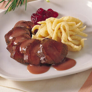 Zwischenzeitlich das Bratfett mit dem Wildfond ablöschen und 5 Min. köcheln lassen. Stärke mit etwas kaltem Wasser anrühren und den Fond damit binden. Mit Salz, Pfeffer und Quittengelee abschmecken. Die Filets mit der Sauce servieren.