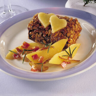 Die nussige Kruste der Hasenfilets verwöhnt den Gaumen zusammen mit der fruchtigen Sauce - ein frisches Kartoffelpüree bringt diesen Genuss zur Vollendung.