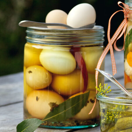 Für die Sole 1 l Wasser aufkochen, Salz und die Gewürze hineingeben. Die kochend heiße Mischung auf die Eier gießen und das Glas verschließen. Die Eier an einem kühlen, dunklen Ort 3-4 Tage durchziehen lassen.