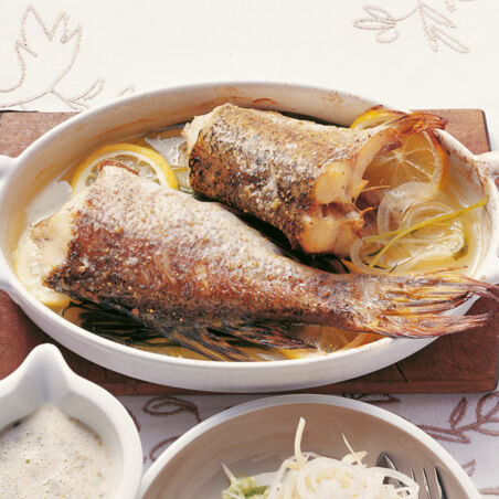 Die Zwiebeln schälen und in dünne Ringe schneiden. Einen länglichen Bräter damit auslegen. Die Petersilie und den Schnittlauch waschen, die Petersilienblättchen abzupfen und beiseite legen. Petersilienstängel und Schnittlauch grob zerschneiden, auf die Zwiebeln legen, die Zitronenscheiben obenauf. Den Fisch mit dem Rücken nach oben auf dieses Bett setzen, Wein und Fischfond angießen, alles salzen und pfeffern. 1 Stück Pergamentpapier mit 1 EL Butter bestreichen und auf den Rücken des Fisches legen. Den Fisch offen im Ofen (Mitte) 25-30 Min. garen.