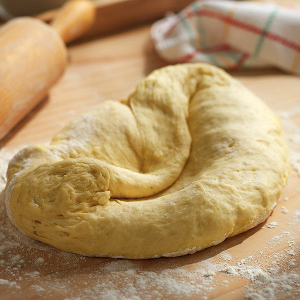 Inzwischen die Butter in der übrigen lauwarmen Milch zerlassen, dazu eventuell nochmals erhitzen und wieder lauwarm abkühlen lassen. Die Butter-Milch-Mischung mit dem restlichen Zucker, 1 Prise Salz und den Eiern zu dem Vorteig geben und alles von Hand oder mit den Knethaken des Handrührgeräts zu einem glatten Teig verkneten. Den Teig kneten, bis er nicht mehr an den Fingern klebt und schön geschmeidig ist – das kann gut 8-10 Min. dauern. Den Teig wieder in die Schüssel geben, mit dem Geschirrtuch abdecken und an einem warmen Ort in ca. 45 Min. bis zur doppelten Größe aufgehen lassen. Den Hefeteig auf der leicht bemehlten Arbeitsfläche nochmals kräftig durchkneten und je nach Rezept weiter verarbeiten.