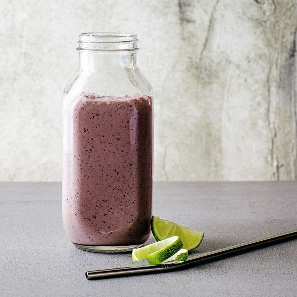 Heidelbeeren, Limettensaft, Mandelmus und Haferflocken mit 300 ml Wasser in einen Hochleistungsmixer geben und alles kräftig durchmixen. Den Smoothie auf zwei Gläser verteilen, mit Limettenzesten garnieren.