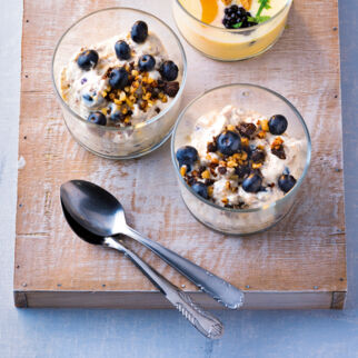 Quark, Milch und Agavendicksaft oder Zucker verrühren. Cantuccini grob zerbrechen und etwa zwei Drittel davon auf den Boden von zwei Gläsern oder Dessertschalen verteilen. Mit 2 EL Orangensaft beträufeln. Die Hälfte des Quarks und das Mandelmus in den Gläsern verteilen. Restliche Cantuccini darauf verteilen und mit restlichem Orangensaft beträufeln. Heidelbeeren, bis auf 2 EL, daraufgeben und restlichen Quark darauf verteilen. Mit übrigen Heidelbeeren abschließen. Zugedeckt mind. 3 Std. kühl stellen.