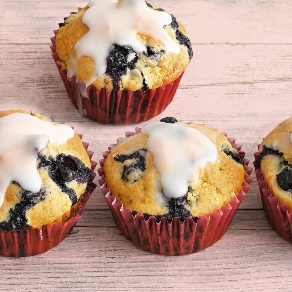 Backofen auf 180° vorheizen. Papierförmchen in der Muffinform verteilen. Heidelbeeren verlesen, waschen und abtropfen lassen. Zitronen waschen und trocken reiben, die Schale fein abreiben. Saft auspressen und 60 ml davon mit der Buttermilch verquirlen, übrigen Saft beiseitestellen. Mehl mit Backpulver mischen und sieben.