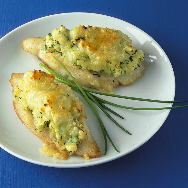 Kräuter abbrausen, trockenschütteln, Dillblättchen fein hacken, Schnittlauch fein schneiden. Kräuter und Käse unter die Kartoffelmasse heben, diese auf dem Fisch verteilen. Im heißen Ofen (Mitte) 20 Min. überbacken.