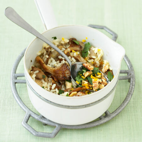 Walnusskerne rösten, abkühlen lassen und hacken. Petersilie abbrausen und trocken schütteln, die Blätter hacken. Mit Walnusskernen und übriger Orangenschale mischen. Restliches Öl erhitzen, übrige Austernpilze darin 4-5 Min. braten, salzen und pfeffern und unter den Risotto mischen. Mit Walnuss-Topping bestreuen.