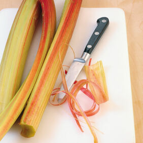 Für den Rotweinrhabarber den Rhabarber putzen, waschen, entfädeln und in 2-3 cm lange Stücke schneiden. 150 ml Rotwein und 40 g Zucker aufkochen, bei mittlerer bis starker Hitze offen ca. 5 Min. leicht sirupartig einkochen. Den Rhabarber dazugeben und ca. 3 Min. mitkochen.