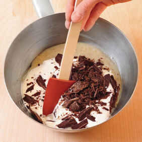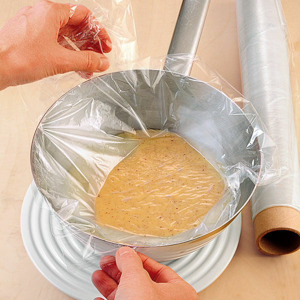 Den Topf erneut auf die Herdplatte stellen, die Eiermilch nochmals aufkochen und vom Herd nehmen. Frischhaltefolie direkt auf die Puddingoberfläche legen, damit sich keine Haut bildet, und den Pudding vollständig auskühlen lassen.