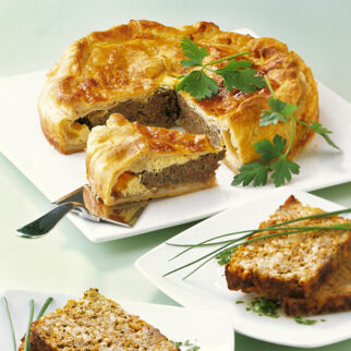 Die Bauernpastete schmeckt warm als Hauptspeise mit Salat oder kalt mit Brot und Preiselbeerkompott.