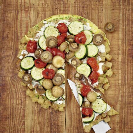 Den Brotfladen auf eine Tortenplatte geben, mit Crème fraîche bestreichen und das Ofengemüse gleichmäßig darauf verteilen. Die Gemüsetorte in 8 Stücke schneiden und servieren. Dazu schmeckt ein grüner Salat.