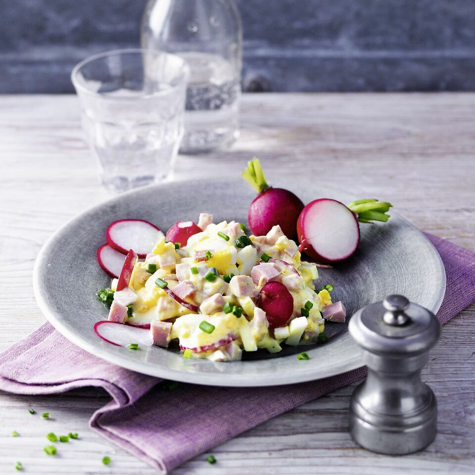 Eier pellen, halbieren und klein würfeln. Putenbrust klein würfeln. Schnittlauch waschen, trocken schütteln und in Röllchen schneiden. Radieschen putzen, waschen, trocken tupfen und in Scheiben schneiden.