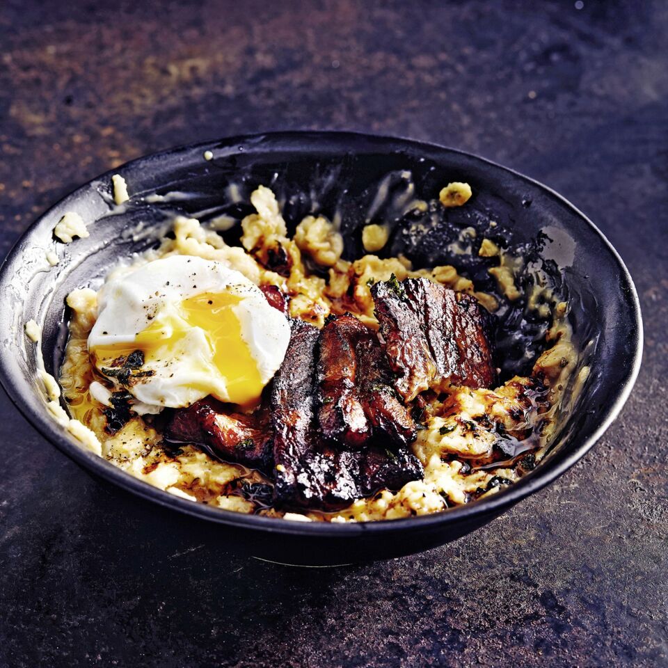 Die Brühe in einem Topf aufkochen und die Haferflocken zugeben. Unter ständigem Rühren bei mittlerer Hitze in ca. 10 Min. einen zähen Brei kochen. Den Cheddar unterrühren. Den Porridge mit Salz und Pfeffer abschmecken, auf zwei Schalen verteilen und Fleisch sowie Ei mit Petersilie darauf anrichten.