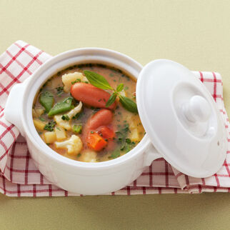 Das vorbereitete Gemüse mit der Hühnerbrühe und dem Suppengrün in einem großen Topf langsam zum Kochen bringen und bei mittlerer Hitze ca. 10 Min. zugedeckt garen.