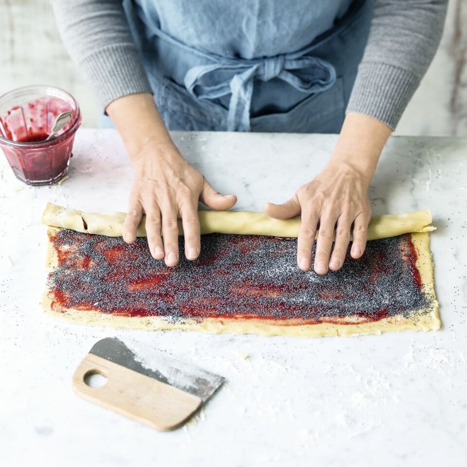 Die Himbeerkonfitüre mit einem Löffel auf der Teigplatte verstreichen. Den Mohn mit dem übrigen Zucker mischen und gleichmäßig daraufstreuen. Die Teigplatte von der langen Seite her aufrollen. Das geht am besten, wenn man die Teigkante zunächst mit einem Tortenheber anhebt, dann die Teigplatte mit etwas Druck aufrollen.