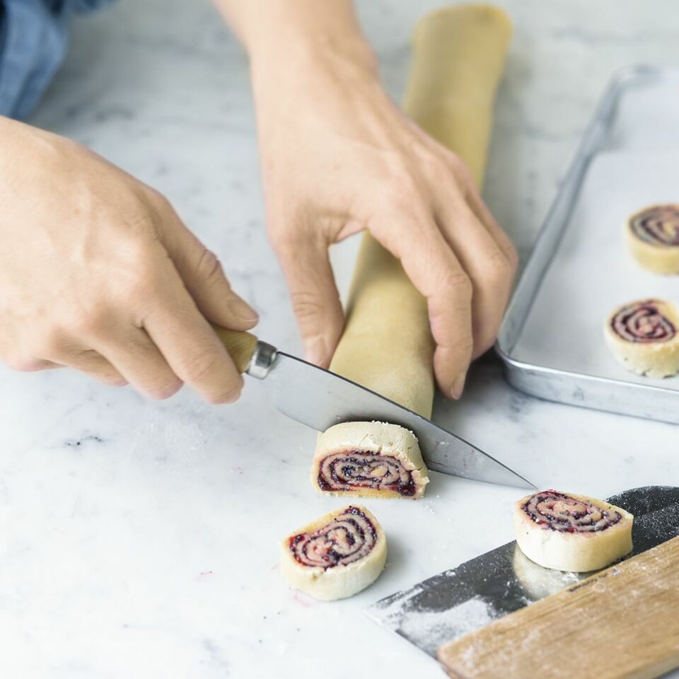 Die Rolle in ca. 1 cm dicke Scheiben schneiden und die Scheiben auf die Backbleche verteilen. Die Schnecken im Ofen (Mitte) pro Blech ca. 13 Min. backen. Herausnehmen, mit dem Backpapier vom Blech ziehen und auf einem Kuchengitter auskühlen lassen.