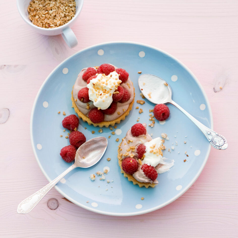 Restliche Sahne vorsichtig auf die Himbeeren setzen und die Torteletts mit Haselnusskrokant bestreut servieren.
