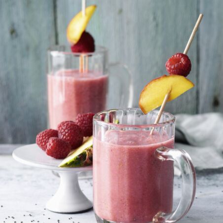 Smoothie in Gläser füllen und mit den beiseitegelegten Himbeeren und Pfirsichspalten dekorieren. Seine Power frisch und gut gelaunt genießen.