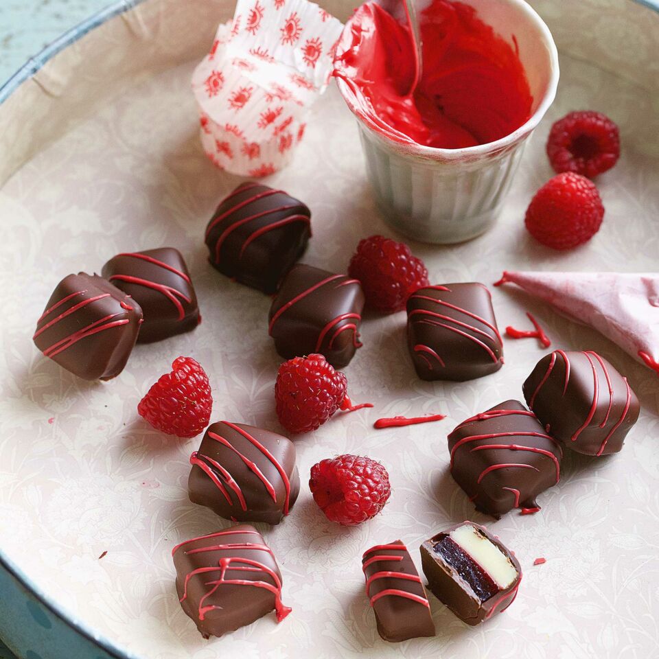 Zum Verzieren die weiße Kuvertüre hacken, schmelzen und auf 28 - 29° temperieren, die Farbe unterrühren. In einen kleinen Papierspritzbeutel füllen und die Pralinen damit verzieren.