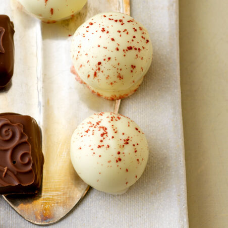 Pralinen mit der Pralinengabel in die temperierte Schokolade tauchen und auf ein mit Butterbrotpapier belegtes Blech legen. Sobald die Schokolade ausgehärtet ist, mit einem Pinsel rotes Glanzpuder auf jede Praline auftragen.