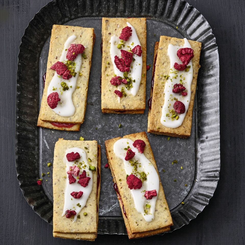 Die Hälfte der Teigstücke mit Himbeerfruchtaufstrich bestreichen. Die restlichen Stücke darauflegen und leicht andrücken. Die Schnitten mit Zuckerguss bestreichen, mit gehackten Himbeeren und Pistazien bestreuen und trocknen lassen.